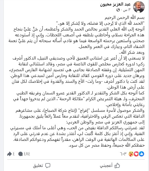 ونشر الفنان عبد العزيز مخيون عبر حسابه الشخصي بموقع التواصل الاجتماعي "فيسبوك": "أتوجه إلى الله العلي القدير بخالص الحمد والشكر وأعظمه، أن مَنَّ عليَّ بنجاح هذه الجراحة بسلام، وأحاطني بلطفه في أصعب اللحظات. وإني إذ أستودعه صحتي وأستعين برحمته الواسعة فيما هو قادم، أسأله سبحانه أن يتم عليَّ نعمة الشفاء التام، ويبارك في العمر والعمل".