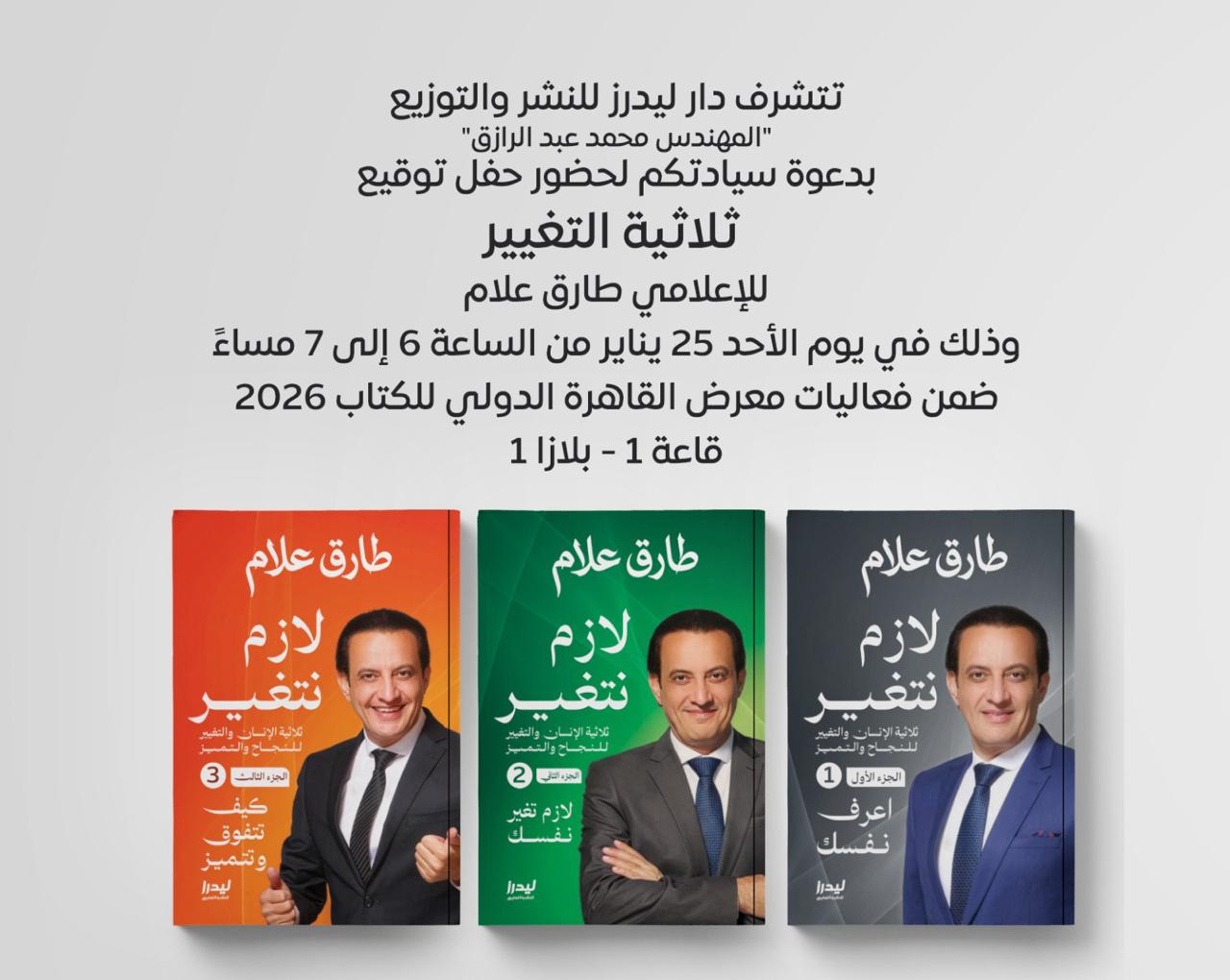 وتتشرف دار ليدرز للنشر والتوزيع "المهندس محمد عبد الرازق بدعوة سيادتكم لحضور حفل توقيع ثلاثية التغيير للإعلامي طارق علام وذلك في يوم الأحد 25 يناير من الساعة 6 إلى 7 مساءً ضمن فعاليات معرض القاهرة الدولي للكتاب 2026قاعة 1 - بلازا 1.
