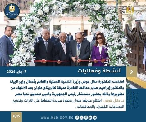 كما افتتحت الدكتورة منال عوض وزيرة التنمية المحلية والقائم بأعمال وزير البيئة يرافقها اللواء أمير سيد أحمد مستشار رئيس الجمهورية للتخطيط العمراني و اللواء أركان حرب أحمد علي، رئيس ديوان رئاسة الجمهورية، أمين صندوق تحيا مصر، والدكتور إبراهيم صابر محافظ القاهرة اليوم حديقة كابريتاج حلوان بعد الانتهاء من أعمال تطويرها وذلك بحضور السفير ايواي فوميو، سفير اليابان بالقاهرة وعدد من قيادات المحافظة والمسئولين .
