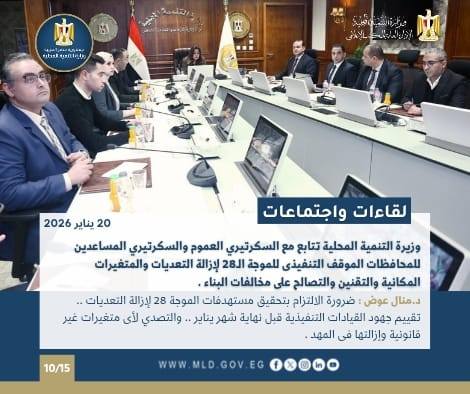 تلقت الدكتورة منال عوض وزيرة التنمية المحلية، تقريراً من قطاع الإدارة الإستراتيجية والتنمية المحلية بالوزارة حول الجهود التي قامت بها الأجهزة التنفيذية بالمحافظات بالتعاون مع قوات إنفاذ القانون وجهات الولاية خلال الأسبوع الأول منذ إنطلاق الموجة الـ28 لإزالة التعديات على أملاك وأراضي الدولة والتصدي لكافة أنواع التعديات والمخالفات، حيث نجحت المحافظات في إزالة عدد 5012 مخالفة متنوعة خلال الفترة من 10 يناير 2026 وحتى 17 يناير 2026، وتتم المتابعة بصفة يومية من خلال مركز السيطرة والشبكة الوطنية بالوزارة للبث المباشر لأعمال الإزالة.