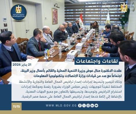 عقدت الدكتورة منال عوض وزيرة التنمية المحلية والقائم بأعمال وزير البيئة، اجتماعاً مع عدد من قيادات وزارة الاتصالات وتكنولوجيا المعلومات بمقر الوزارة بالعاصمة الجديدة لاستعراض آخر مستجدات التنسيق الجاري بين الوزارتين فيما يخص خطوات تيسير وتبسيط إجراءات إصدار تراخيص المحال العامة والتجارية والأنشطة المختلفة تنفيذاً لتوجيهات رئيس مجلس الوزراء بضرورة رقمنة وحوكمة إجراءات استخراج التراخيص وتوحيدها، وتبسيطها بالتعاون مع جميع الجهات المعنية مثل الحماية المدينة والهيئة القومية لسلامة الغذاء وغيرها من الجهات، بالإضافة إلي إتاحة خدمة إصدار تراخيص المحال العامة علي منصة مصر الرقمية.
