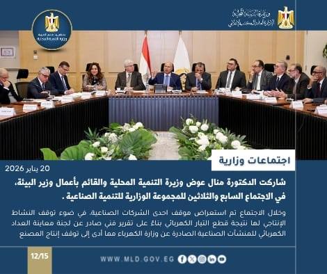 وشاركت الدكتورة منال عوض وزيرة التنمية المحلية والقائم بأعمال وزير البيئة، في الاجتماع السابع والثلاثين للمجموعة الوزارية للتنمية الصناعية، برئاسة الفريق مهندس كامل الوزير، نائب رئيس مجلس الوزراء للتنمية الصناعية وزير الصناعة والنقل، وخلال الاجتماع تم استعراض موقف احدى الشركات الصناعية، في ضوء توقف النشاط الإنتاجي لها نتيجة قطع التيار الكهربائي بناءً على تقرير فني صادر عن لجنة معاينة العداد الكهربائي للمنشآت الصناعية الصادرة عن وزارة الكهرباء مما أدى إلى توقف إنتاج المصنع.
