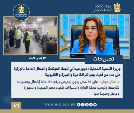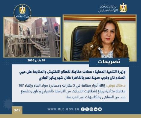 كما أعلنت الدكتورة منال عوض وزيرة التنمية المحلية، عن قيام لجنة من قطاع تقويم الأداء والتفتيش والرقابة والمتابعة بالوزارة بالمرور المفاجئ خلال النصف الأول من شهر يناير الجاري على أحياء السلام ثان وغرب مدينة نصر بمحافظة القاهرة ، لمتابعة أداء المراكز التكنولوجية وموقف طلبات المواطنين وفحص ملفات التراخيص والتقنين ومخالفات البناء والمتغيرات المكانية والتعديات على أملاك الدولة والتصالح ومشروعات الخطة الاستثمارية ومنظومة النظافة والإنارة والاشغالات والمحال العامة.