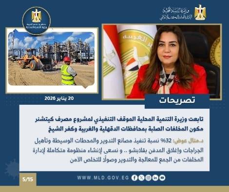 تلقت الدكتورة منال عوض وزيرة التنمية المحلية ، تقريراً حول الموقف التنفيذي لمشروع مصرف كيتشنر - مكون المخلفات الصلبة - والذي تنفذه وزارة التنمية المحلية بمحافظات الدقهلية والغربية وكفر الشيخ، بتمويل من البنك الأوروبي لإعادة الإعمار والتنمية بقيمة 79 مليون يورو، إلى جانب منحة دعم فني من الاتحاد الأوروبي بقيمة 8 ملايين يورو، مشيرًة إلي أن نسبة تنفيذ مصانع التدوير والمحطات الوسيطة وتأهيل الجراجات وإغلاق المدفن بقلابشو بلغت حوالي 32% .