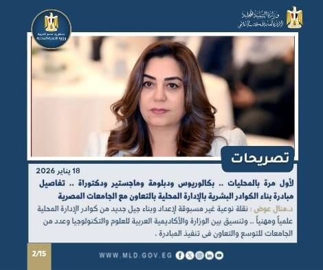 أكدت الدكتورة منال عوض وزيرة التنمية المحلية، قيام الوزارة بالتنسيق خلال الفترة الجارية لتوقيع بروتوكولات للتعاون بين مركز التنمية المحلية للتدريب بسقارة والأكاديمية العربية للعلوم والتكنولوجيا والنقل البحري وعدد من الجامعات الحكومية والخاصة من بينها طنطا والمنصورة وأكاديمية السادات للعلوم الإدارية ، للتوسع في تنفيذ مبادرة بناء الكوادر البشرية بالإدارة المحلية بالتعاون مع الجامعات المصرية والمؤسسات الأكاديمية والبحثية الحكومية والخاصة ، والتي أطلقتها الوزارة خلال شهر يناير الجاري مع جامعة بنها .