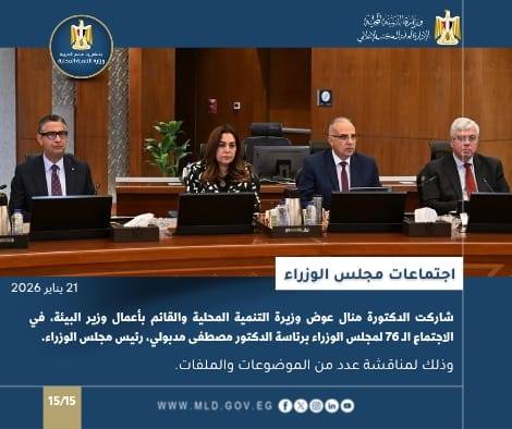 كما شاركت الدكتورة منال عوض وزيرة التنمية المحلية والقائم بأعمال وزير البيئة، في الاجتماع الأسبوعي للحكومة، بمقرها في العاصمة الجديدة؛ برئاسة الدكتور مصطفي مدبولي رئيس مجلس الوزراء، وذلك لمناقشة عدد من الموضوعات والملفات.
