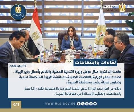 كما عقدت الدكتورة منال عوض وزيرة التنمية المحلية، اجتماعاً مع عدد من القيادات بمقر الوزارة بالعاصمة الجديدة لمناقشة الرؤية المتكاملة لتنمية وتطوير مدينة رشيد بمحافظة البحيرة، وذلك في إطار توجه الوزارة لدعم التنمية العمرانية والاقتصادية بالمدن التاريخية بالمحافظات وتعظيم الاستفادة من مقوماتها الفريدة .
