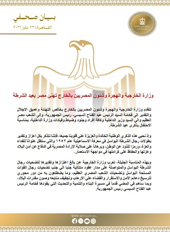 تتقدم وزارة الخارجية والهجرة وشئون المصريين بالخارج بخالص التهنئة وعميق الاجلال والتقدير إلى الرئيس عبد الفتاح السيسي، رئيس الجمهورية، وإلى الشعب مصر العظيم والي وزير الداخلية وكافة أفراد وجنود وضباط وقيادات وزارة الداخلية، بمناسبة الاحتفال بذكرى عيد الشرطة.