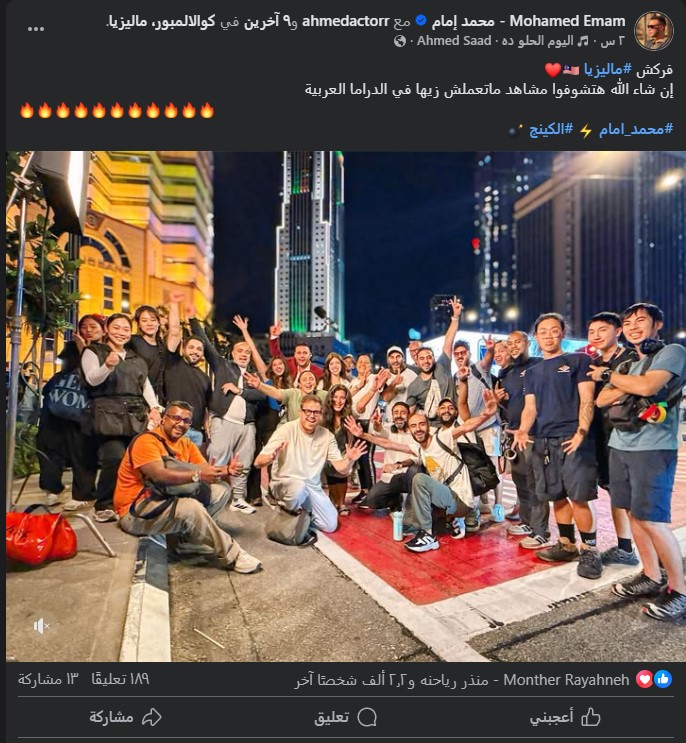 ونشر محمد إمام صورة تجمعه بصناع مسلسل "الكينج" على حسابه الشخصي بموقع التواصل الاجتماعي فيسبوك وعلق قائلاً: "فركش ماليزيا، إن شاء الله هتشوفوا مشاهد ما تتعملش زيها في الدراما العربية".