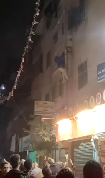 وظهر في الفيديو، السيدة وهي تمسك بالصغار وتلقي بهم من علو، وسط صراخ واستغاثات الأهالي المتواجدين أسفل العقار، في مشهد أثار حالة من الذهول والصدمة بين المتابعين.
