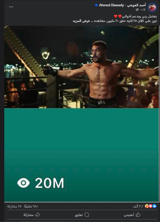 حقق الفنان أحمد العوضي 20 مليون مشاهدة بعد طرح البرومو التشويقي الأول لمسلسله الجديد "على كلاى " المقرر عرضه في الماراثون الرمضاني المقبل 2026، على قنوات ومنصات الشركة المتحدة للخدمات الإعلامية.
