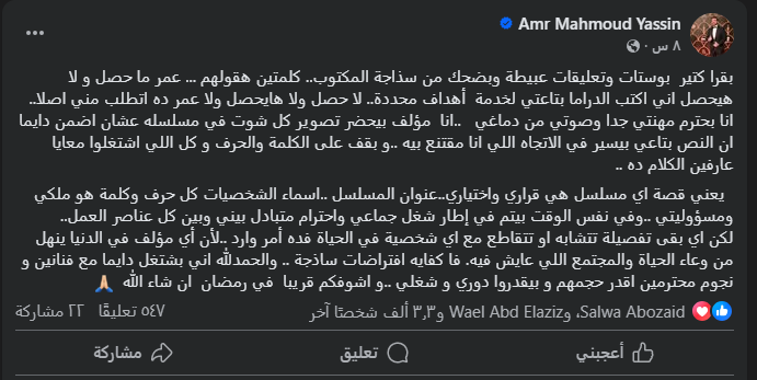 ونشر السيناريست عمرو محمود ياسين منشوراً عبر حسابه الشخصي بموقع التواصل الاجتماعي فيسبوك، قائلاً: "أقرأ كثيراً بوستات وتعليقات عبيطة وأضحك من سذاجة المكتوب، كلمتين سأقولهما: عمره ما حصل ولا سيحصل أن أكتب الدراما بتاعتي لخدمة أهداف محددة، لا حصل ولا سيحصل، ولا عمر هذا طُلب مني أصلاً".