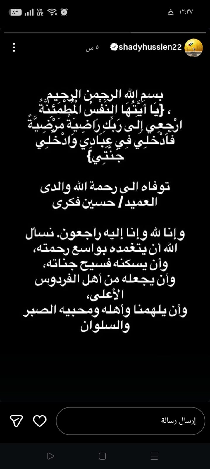 ونشر اللاعب عبر استوري انستجرام أعلن فيه وفاة والده العميد حسين فكري مع تلقيه الخبر بكل صبر واحتساب