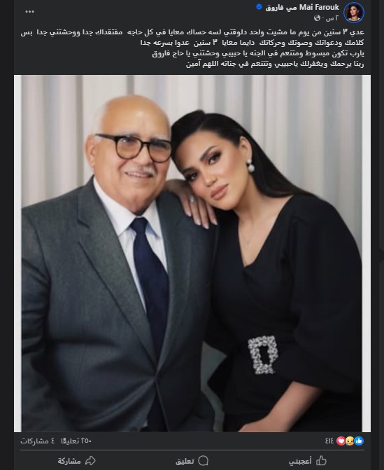 ونشرت الفنانة مي فاروق عبر حسابها الشخصي بموقع التواصل الاجتماعي فيسبوك: "عدى 3 سنين من يوم ما مشيت ولحد دلوقتي لسه حساك معايا في كل حاجة، مفتقداك جداً ووحشتني جداً، بس كلامك ودعواتك وصوتك وحركاتك دايماً معايا. 3 سنين عدوا بسرعة جداً".