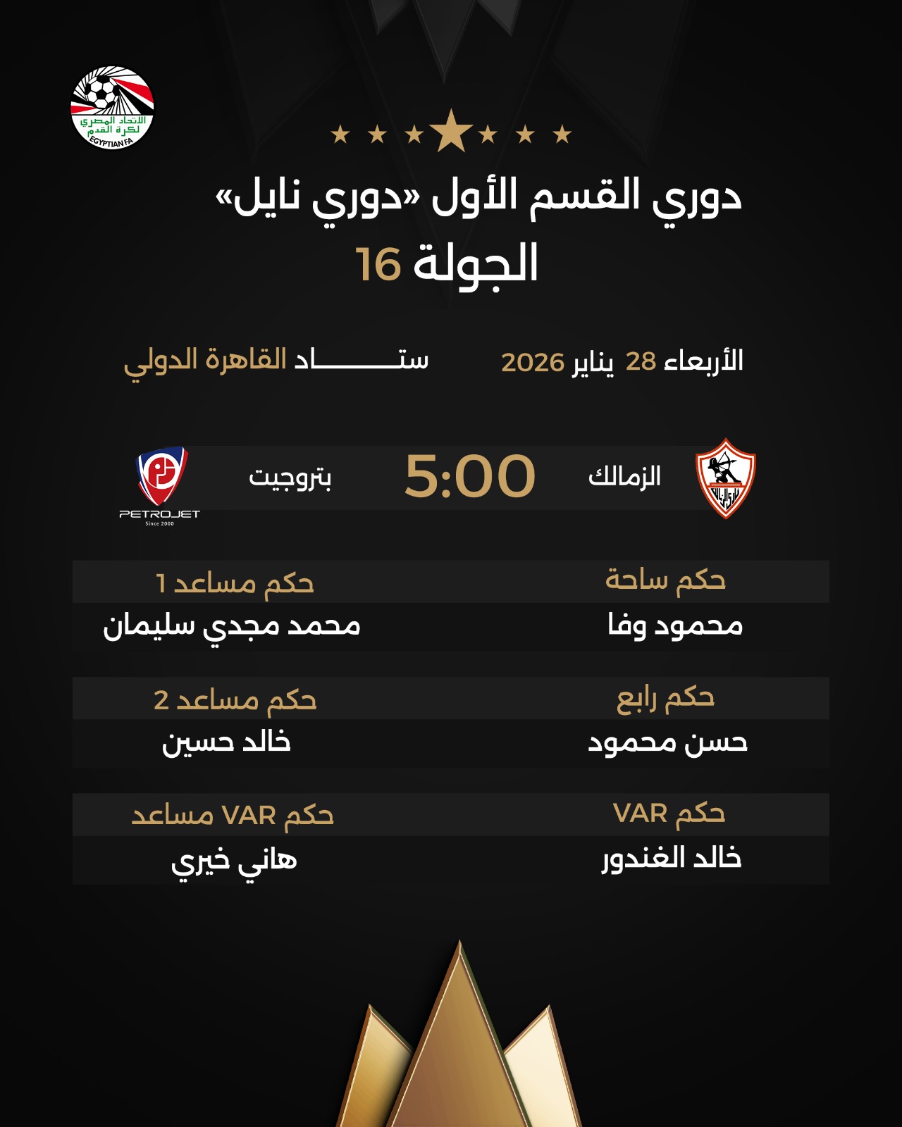 ويدير مباراة الزمالك وبتروجت محمود وفا حكمًا للساحة، يعاونه كلًا من: محمد مجدي سليمان، وخالد حسين، وحسن محمود حكمًا رابعًا.
