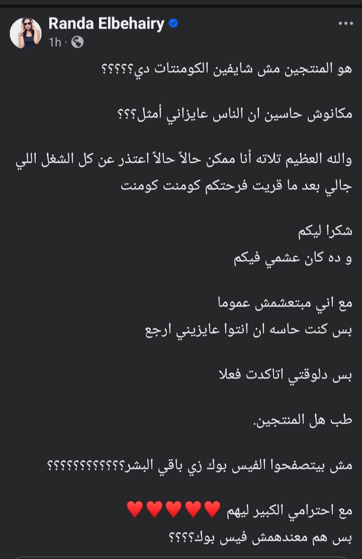 وكتبت راندا البحيري عبر حسابها الرسمي بموقع التواصل الاجتماعي “انستجرام”، وعلقت عليها قائلة: هو المنتجين مش شايفين الكومنتات دي، مكانوش حاسين ان الناس عايزاني أمثل، والله العظيم تلاته أنا ممكن حالاً حالاً اعتذر عن كل الشغل اللي جالي بعد ما قريت فرحتكم كومنت كومنت، شكرا ليكم و ده كان عشمي فيكم".
