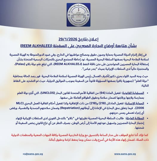 في إطار التزام الدولة المصرية بحماية وصون حقوق ومصالح مواطنيها في الخارج، وفي ضوء الدبلوماسية المصرية للهيئة المصرية للملاحه البحرية بوصفها السلطة البحرية المصرية، نود إحاطة المجتمع البحري الرسمي المتحركة بشأن احتجاز البحارة المصريين المتواجدين على متن ناقلة النفط (REEM ALKHALEEJ) التي ترفع علم دولة إسلامية (Palau)، والمحتجزة حاليًا لدى السلطات الإيرانية بميناء " بندر عباس ".