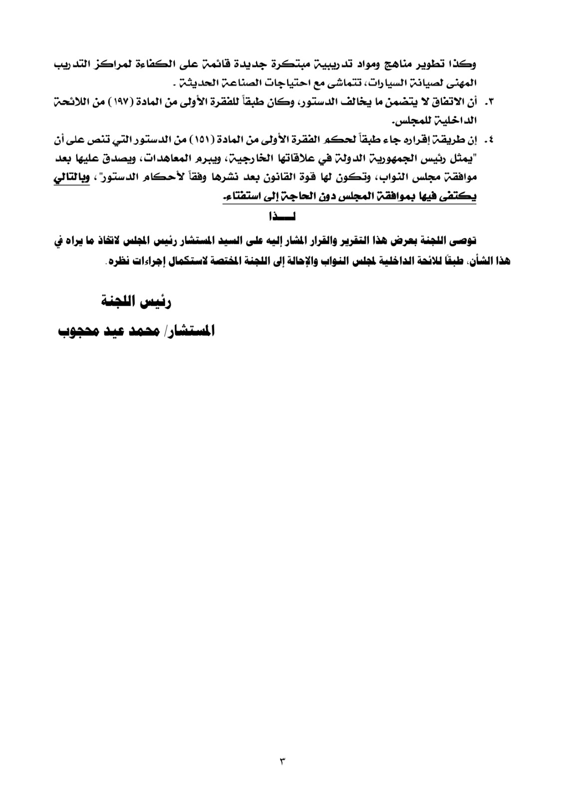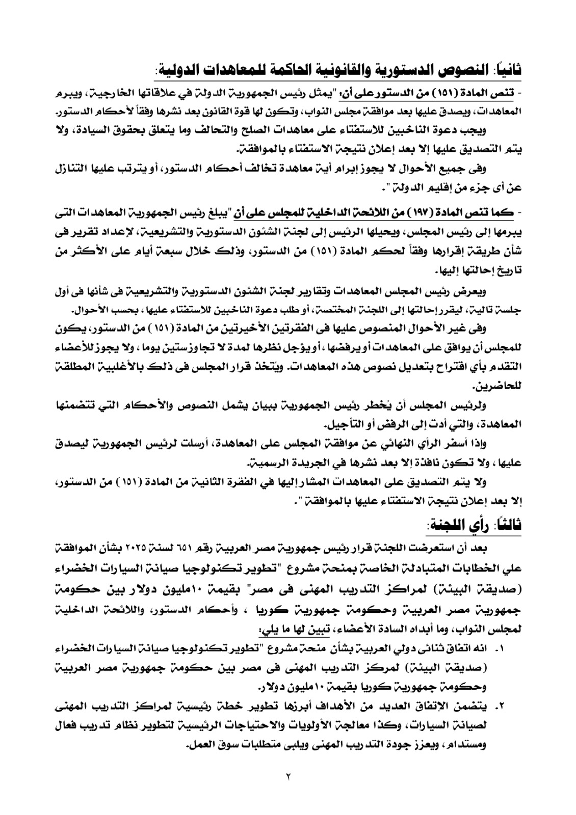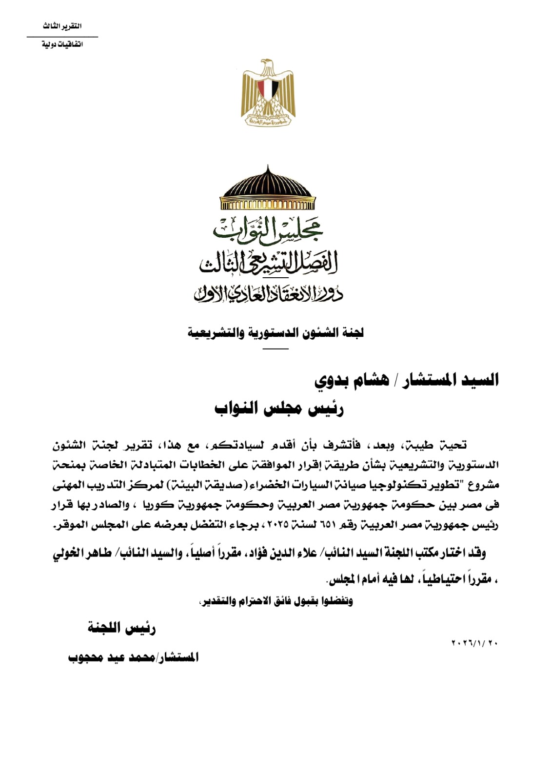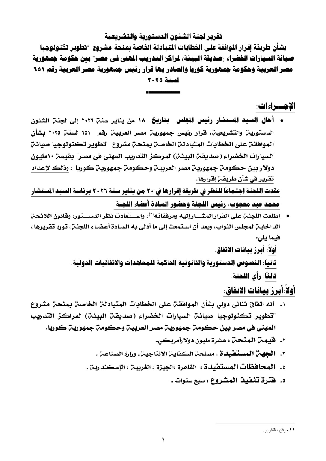 ينفرد "بصراحة"، بتوصيات لجنة الشئون الدستورية والتشريعية بمجلس النواب، بشأن منحة مشروع "تطوير تكنولوجيا صيانة السيارات الخضراء" صديقة البيئة لمراكز التدريب المهنى فى مصر" بين حكومة جمهورية مصر العربية وحكومة جمهورية كوريا والصادر بها قرار رئيس جمهورية مصر العربية رقم 651.