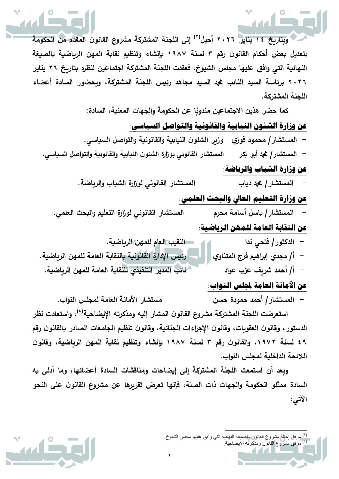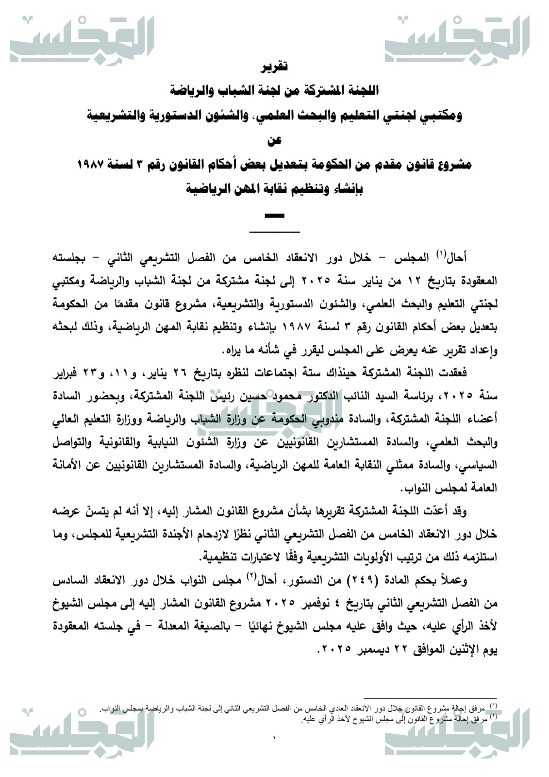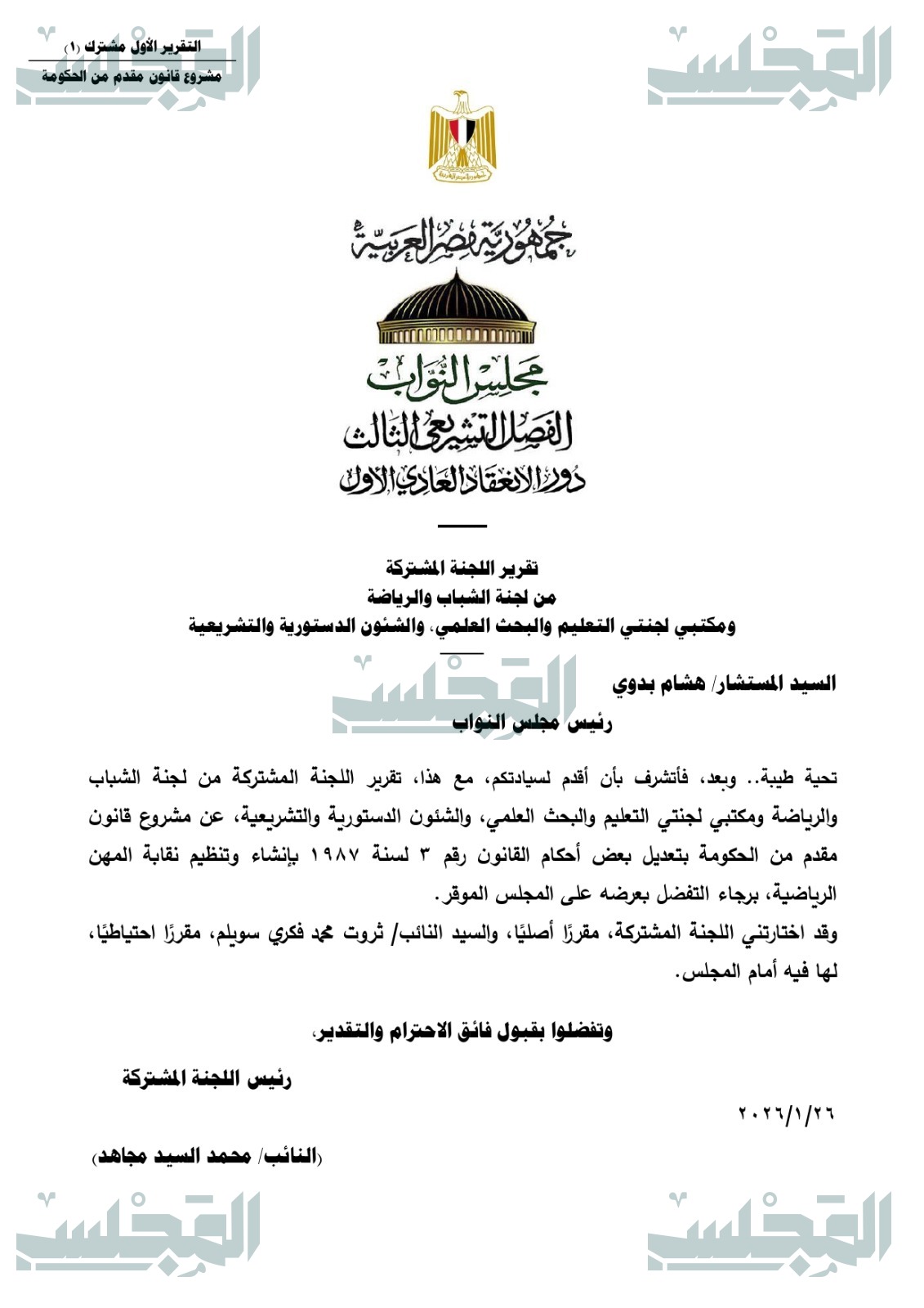 ننفرد بتقرير لجان النواب عن مشروع قانون نقابة المهن الرياضية