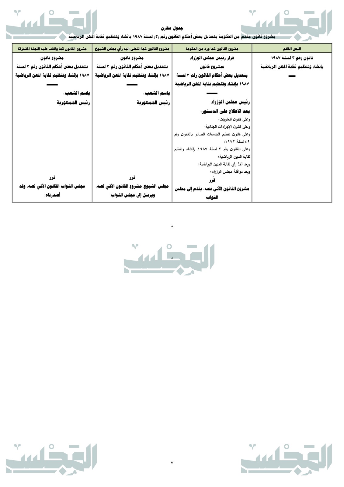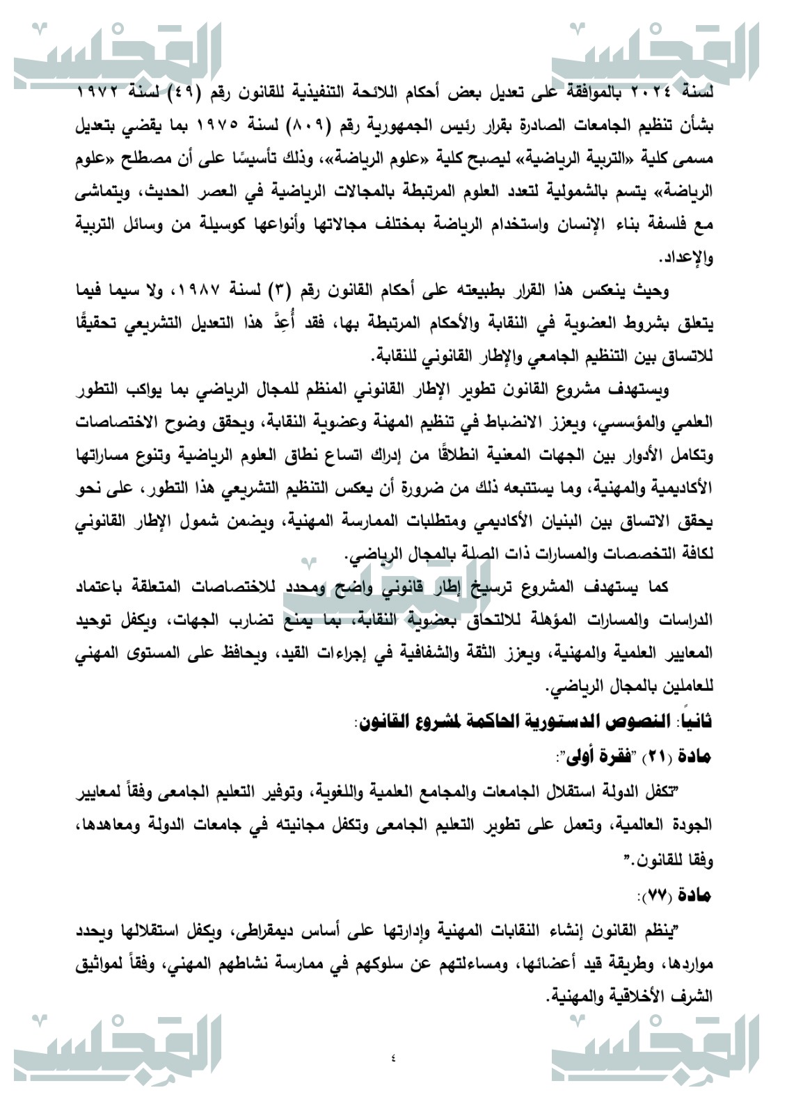 والذي يهدف إلى تطوير الإطار القانوني المنظم للمجال الرياضي بما يواكب التطور العلمي والمؤسسي، ويعزز الانضباط في تنظيم المهنة وعضوية النقابة، ويحقق وضوح الاختصاصات وتكامل الأدوار بين الجهات المعنية انطلاقًا من إدراك اتساع نطاق العلوم الرياضية وتنوع مساراتها الأكاديمية والمهنية، وما يستتبعه ذلك من ضرورة أن يعكس التنظيم التشريعي هذا التطور، على نحو يحقق الاتساق بين البنيان الأكاديمي ومتطلبات الممارسة المهنية، ويضمن شمول الإطار القانوني لكافة التخصصات والمسارات ذات الصلة بالمجال الرياضي.