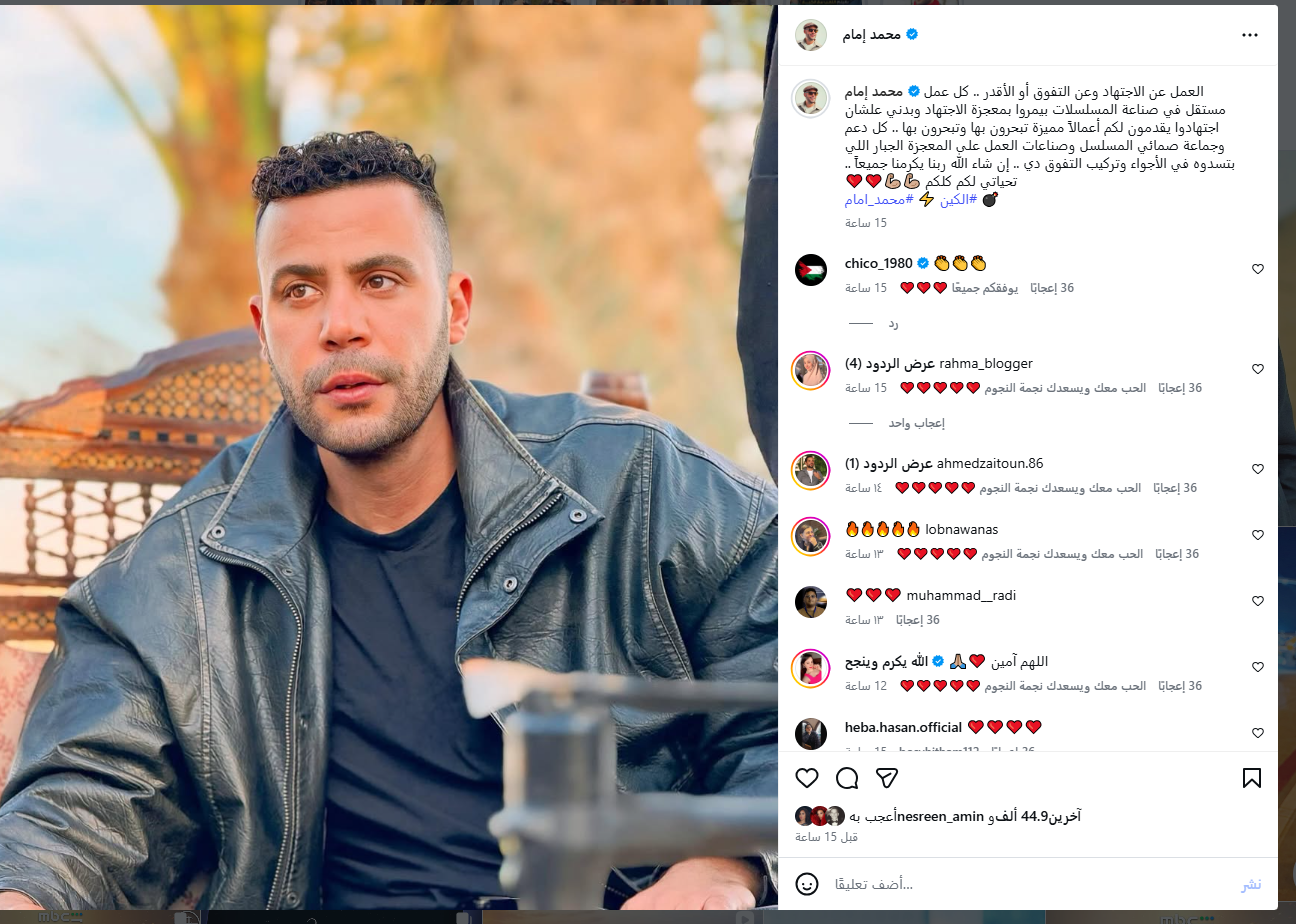 وكتب محمد إمام عبر حسابه الشخصي بموقع التواصل الاجتماعي انستجرام: "بعيدًا عن المنافسة وعن الأعلى أو الأنجح.. كل العاملين حاليًا في صناعة المسلسلات بيبذلوا مجهودًا عصبيًا وبدنيًا علشان يقدروا يقدموا أعمالًا مميزة تبسطكم وتستمتعوا بيها، كل الدعم والاحترام لزملائي الفنانين وصناع الأعمال على المجهود الجبار اللي بيبذلوه في الأجواء والأوقات الصعبة دي، إن شاء الله ربنا يكرمنا جميعًا، تحياتي ليكم كلكم".