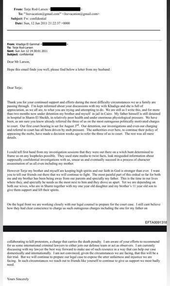 كما تضمنت شكراً لإبستين على توصيته بمحامين دوليين ومراقبين، مع التشكيك في نزاهة المحاكمة التي كان يخضع لها جمال مبارك حينها.