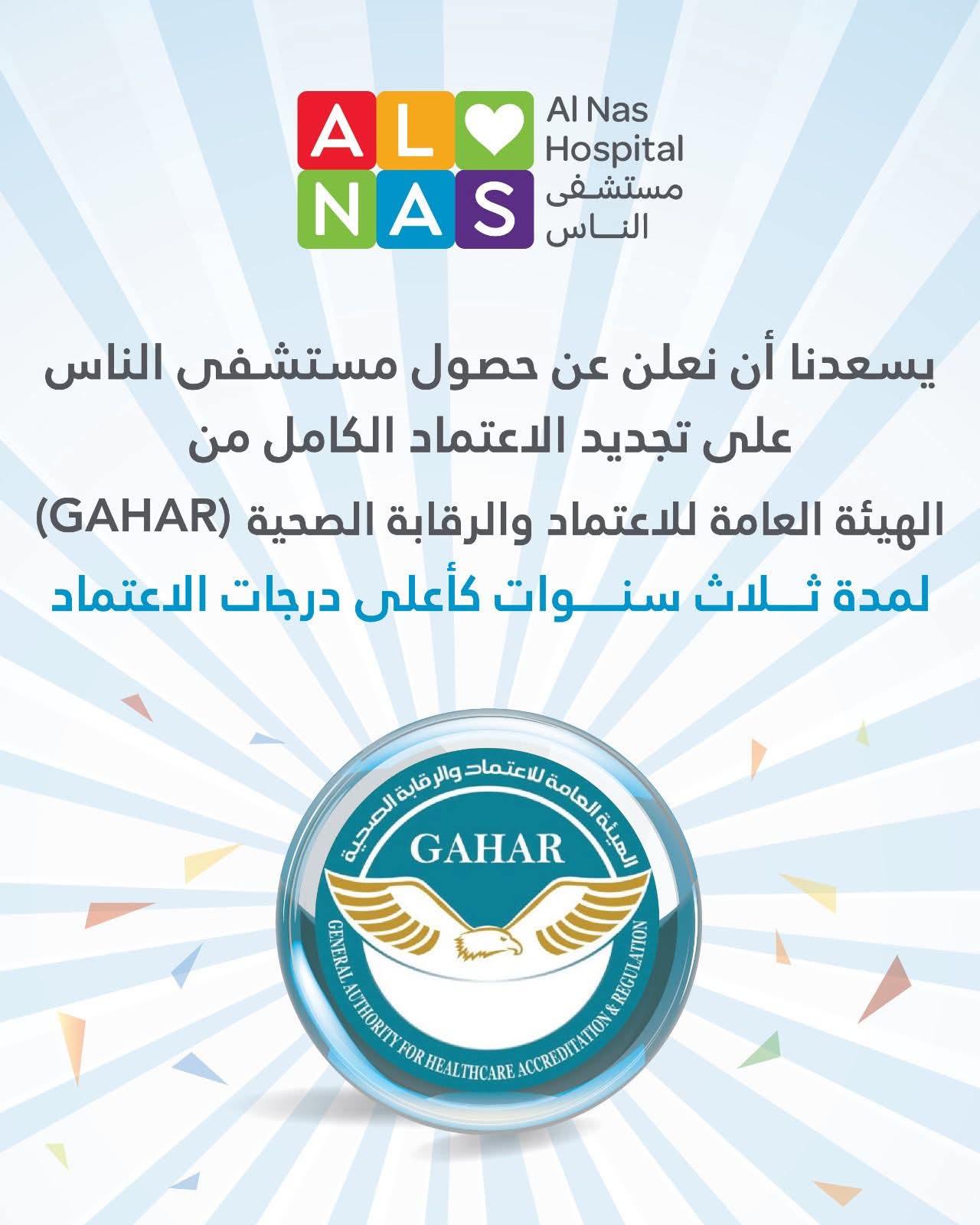 يأتي حصول مستشفى الناس على تجديد شهادة الاعتماد الكامل «GAHAR» من قبل الهيئة العامة للاعتماد والرقابة الصحية، تكليلًا لدورها الخدمي الرائد في مجال الرعاية الصحية وتحقيق سلامة المرضى وفقًا للمعايير القومية والعالمية.
