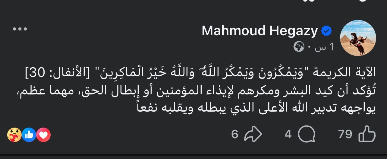 ونشر حجازي، آية قرآنية جاء نصها: «وَيَمْكُرُونَ وَيَمْكُرُ اللَّهُ وَاللَّهُ خَيْرُ الْمَاكِرِينَ» [الأنفال: 30]، في إشارة منه إلى أن كيد البشر ومكرهم لإيذاء المؤمنين أو إبطال الحق، مهما بلغ، يقابله تدبير إلهي أعلى يُبطله ويقلبه نفعًا..