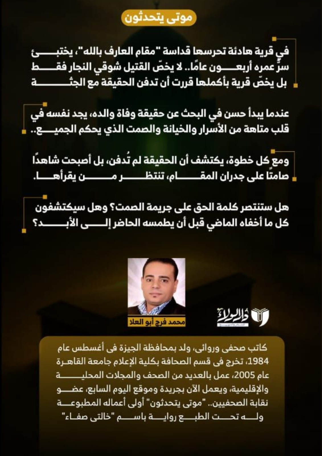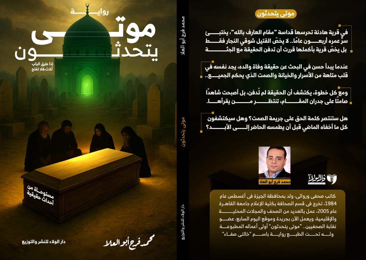 صدر حديثًا عن دار الولاء للنشر والتوزيع، بالتعاون مع مبادرة خطوط لدعم الكتاب، رواية جديدة بعنوان "موتى يتحدثون" للكاتب الصحفى محمد فرج أبو العلا، والتي شاركت في فعاليات معرض القاهرة الدولي للكتاب 2026، خلال الفترة من 21 يناير حتى 3 فبراير 2026.