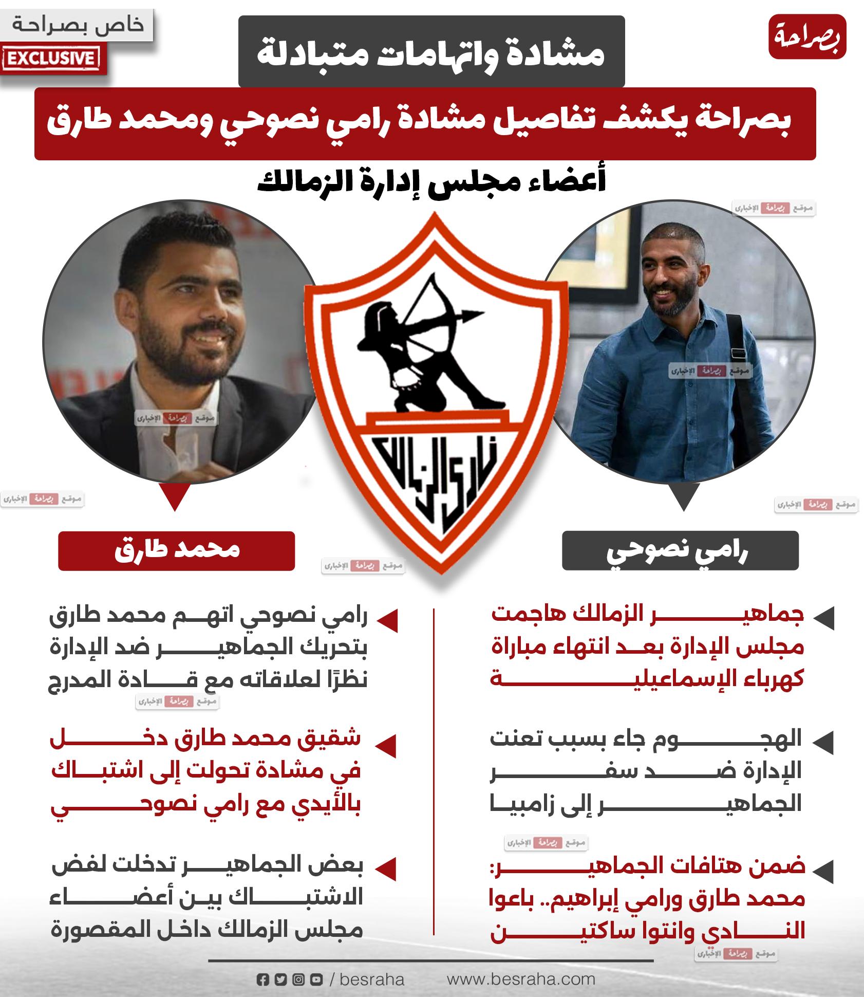 وعلم «بصراحة» من مصادره داخل نادي الزمالك، أن الثنائي: رامي إبراهيم نصوحي، ومحمد طارق، أعضاء مجلس إدارة القلعة البيضاء، دخلا في مشادة كبرى عقب انتهاء المباراة.
