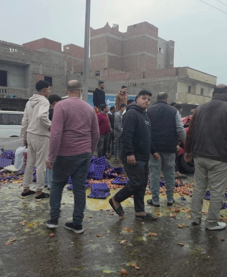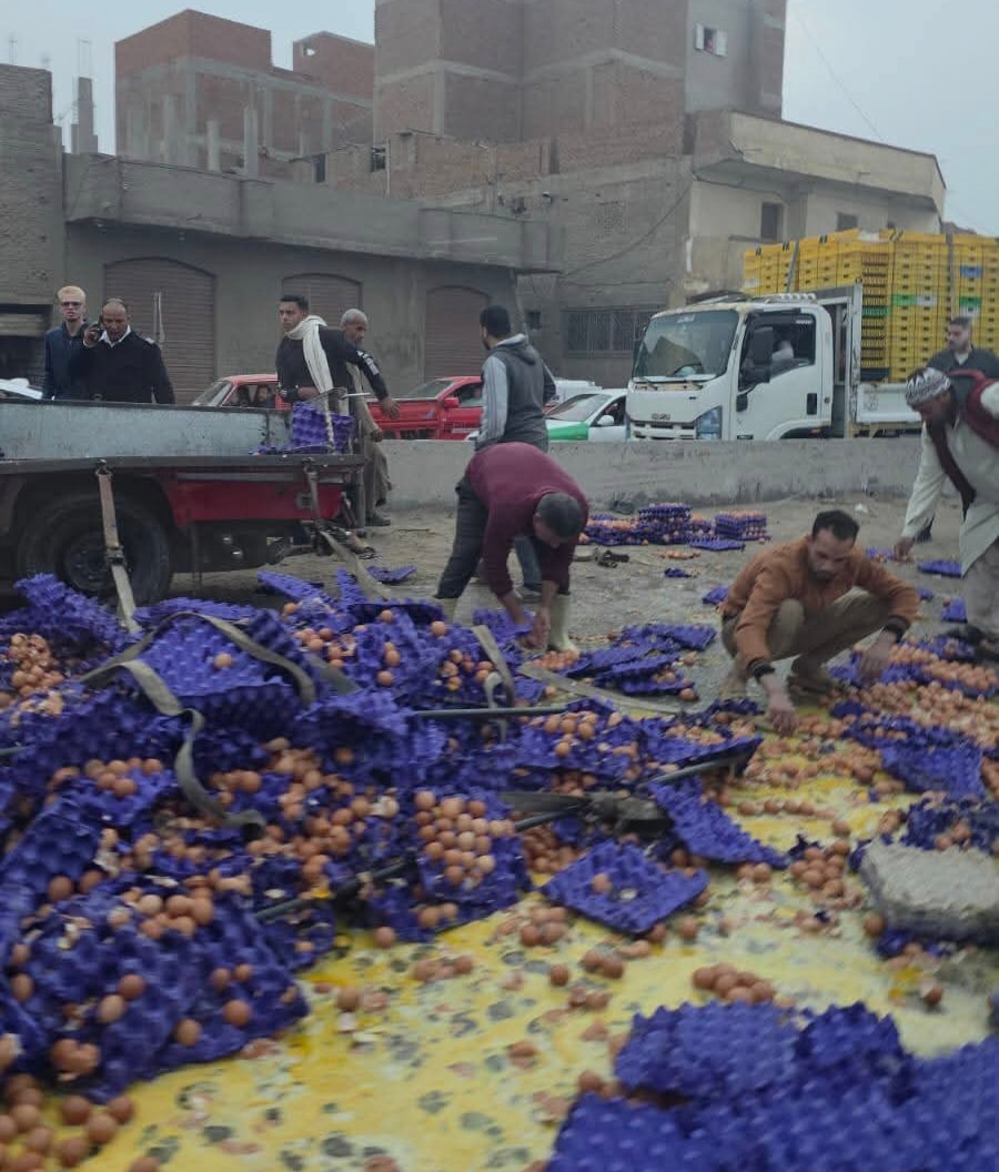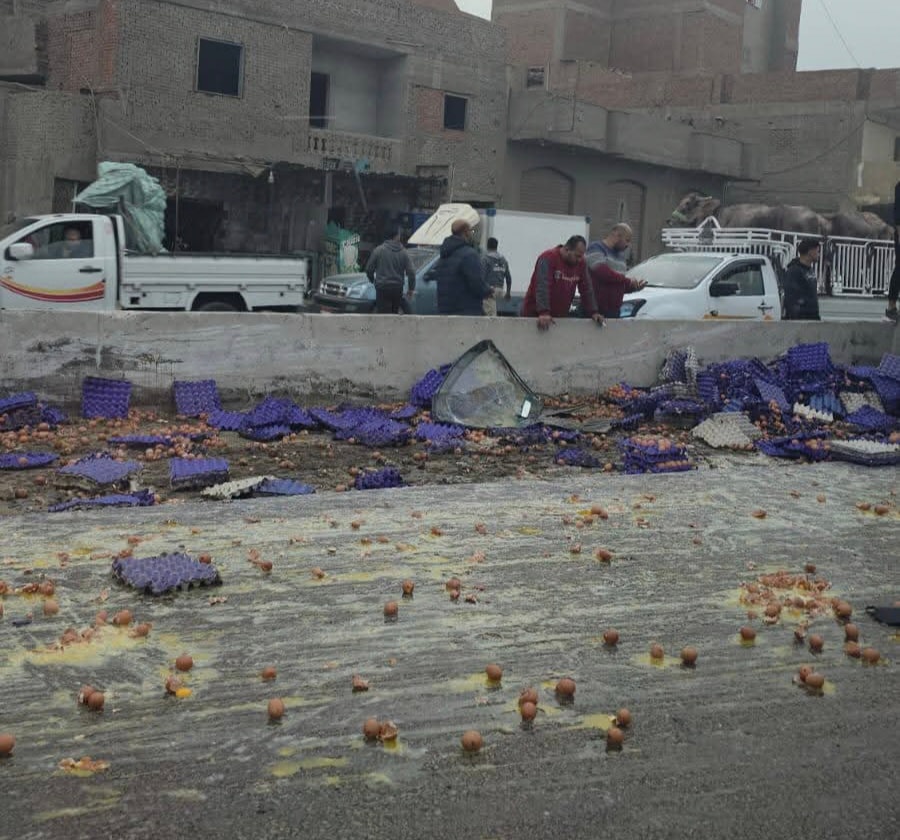 وتبين من الفحص، أنه أثناء سير السيارة في اتجاه محافظة القاهرة ، اختلت عجلة القيادة في يد السائق نتيجة تفادي إحدى المركبات، مما أدى إلى انحراف الشاحنة وانقلابها على جانب الطريق، مسببةً تكسر مئات الآلاف من البيض التي غطت مساحة واسعة من الطريق الأسفلتي.