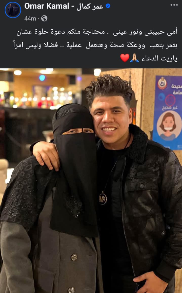 وكتب عمر كمال عبر حسابه الرسمي بموقع التواصل الاجتماعي “فيسبوك"، وعلق عليه قائلا: أمي حبيبتي ونور عيني محتاجة دعوة حلوة، علشان بتمر بتعب ووعكة صحية وهتعمل عملية، فضلا وليس أمرا، يا ريت الدعاء".