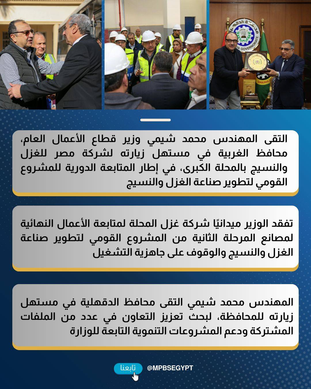 تضمنت تحركات الوزارة خلال الشهر جولات ميدانية موسعة لمتابعة المشروعات الكبرى، وعلى رأسها المشروع القومي لتطوير صناعة الغزل والنسيج، مع قرب الانتهاء من المرحلة الثانية واكتمال تطوير شركة مصر للغزل والنسيج بالمحلة الكبرى، ومتابعة جاهزية التشغيل للمصانع الجديدة.