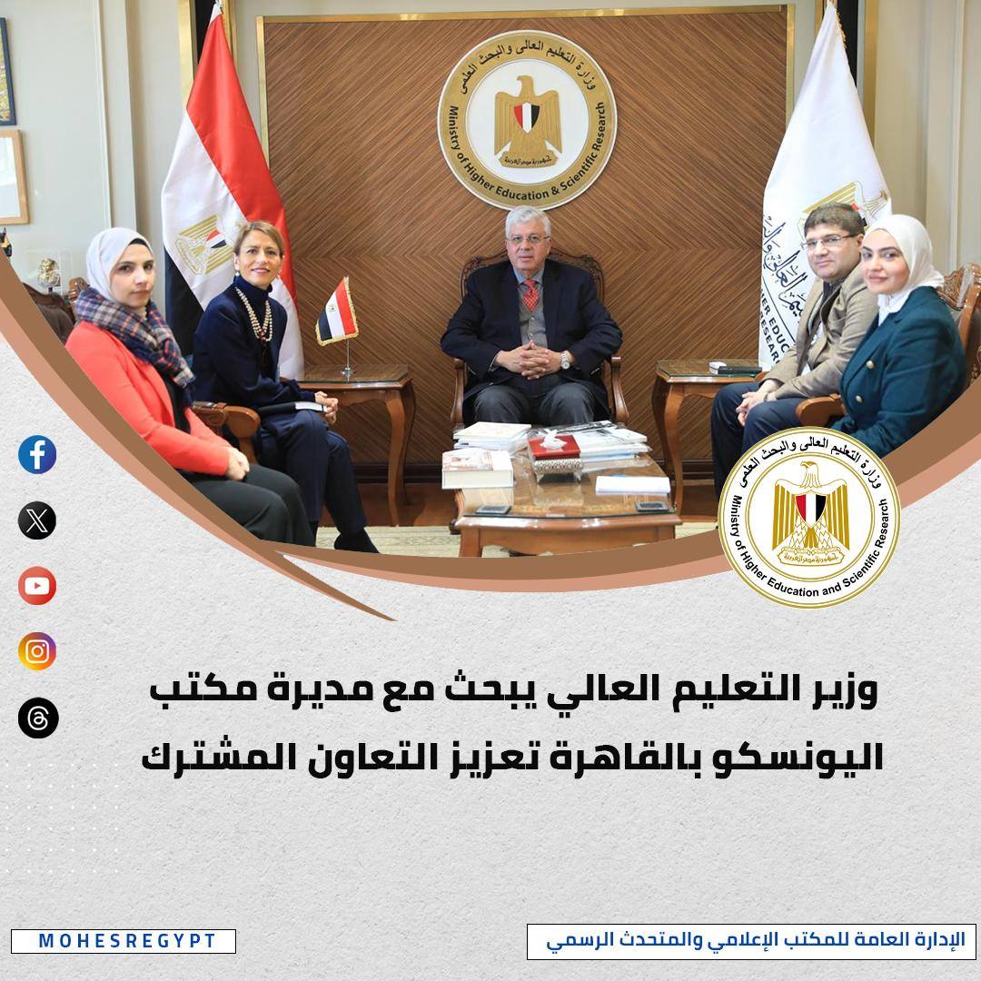 استقبل الوزير الدكتورة نوريا سانز، مديرة مكتب منظمة اليونسكو الإقليمي بالقاهرة، وأكد حرص مصر على تعميق التعاون مع المنظمة في مجالات التعليم العالي والبحث العلمي والابتكار، ومناقشة تعزيز كفاءة الكوادر البشرية بالمكتب وتوسيع نطاق المبادرات المشتركة.