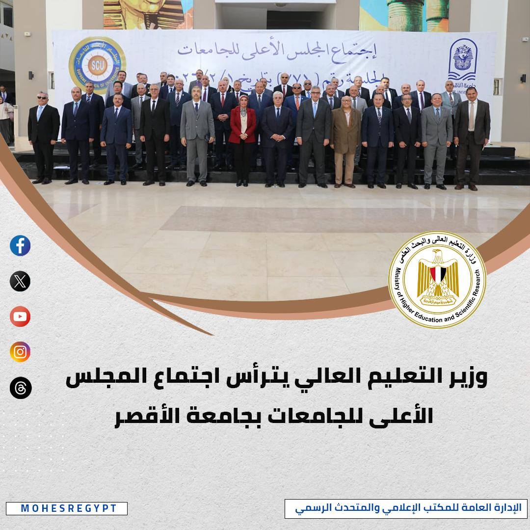 عقد المجلس الأعلى للجامعات اجتماعه الدوري برئاسة الدكتور أيمن عاشور، وخلال الاجتماع شهد المجلس توقيع بروتوكول تعاون بين جامعة الأقصر وجامعة أسيوط، بهدف التعاون في مجالات التعليم والتدريس والبحث العلمي والندوات العلمية والمؤتمرات، وتنظيم برامج تدريبية وبحثية في مرحلة الدراسات العليا.