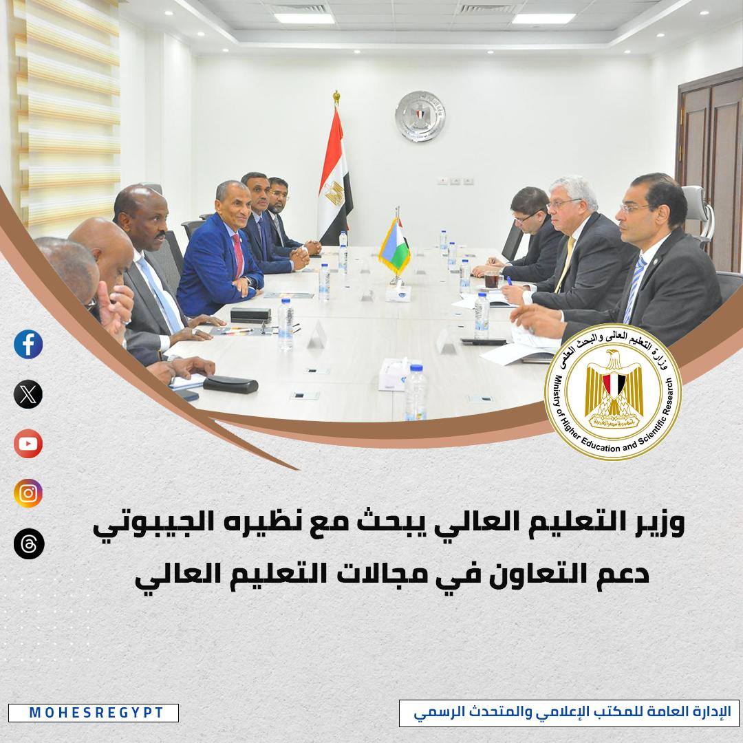 استقبل الوزير نظيره في دولة جيبوتي، الدكتور نبيل محمد أحمد، والسفير أحمد علي بري، لبحث سبل تعزيز التعاون في مجالات التعليم العالي والبحث العلمي، بما يشمل تدريس اللغة العربية والإنجليزية وإجراء أبحاث علمية مشتركة والاستفادة من الخبرات المصرية.