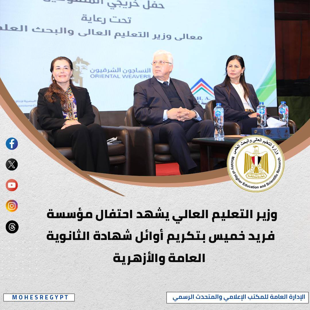 شهد الوزير الحفل السنوي لمؤسسة محمد فريد خميس لتكريم المائة الأوائل في الثانوية العامة والأزهرية، مؤكدًا أهمية الشراكة المجتمعية، ومشيرًا إلى التعاون مع البنك المركزي المصري لإطلاق منحة "علماء المستقبل" لدعم أكثر من 35 ألف منحة كلية وجزئية، مع تقدير دور الجامعة البريطانية في تقديم منح دراسية.