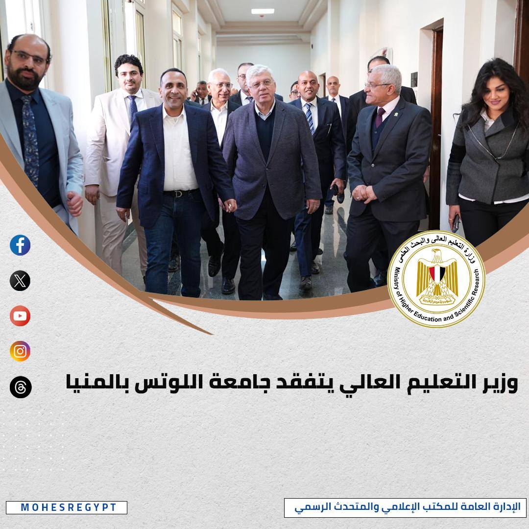 تفقد الوزير جامعة اللوتس بمحافظة المنيا، واطلع على منشآت الجامعة من قاعات وفصول ومعامل وورش تدريب ومكاتب أعضاء هيئة التدريس، مؤكداً أهمية التكامل بين المؤسسات التعليمية لتطوير المنظومة التعليمية والبحثية بما يخدم احتياجات سوق العمل.