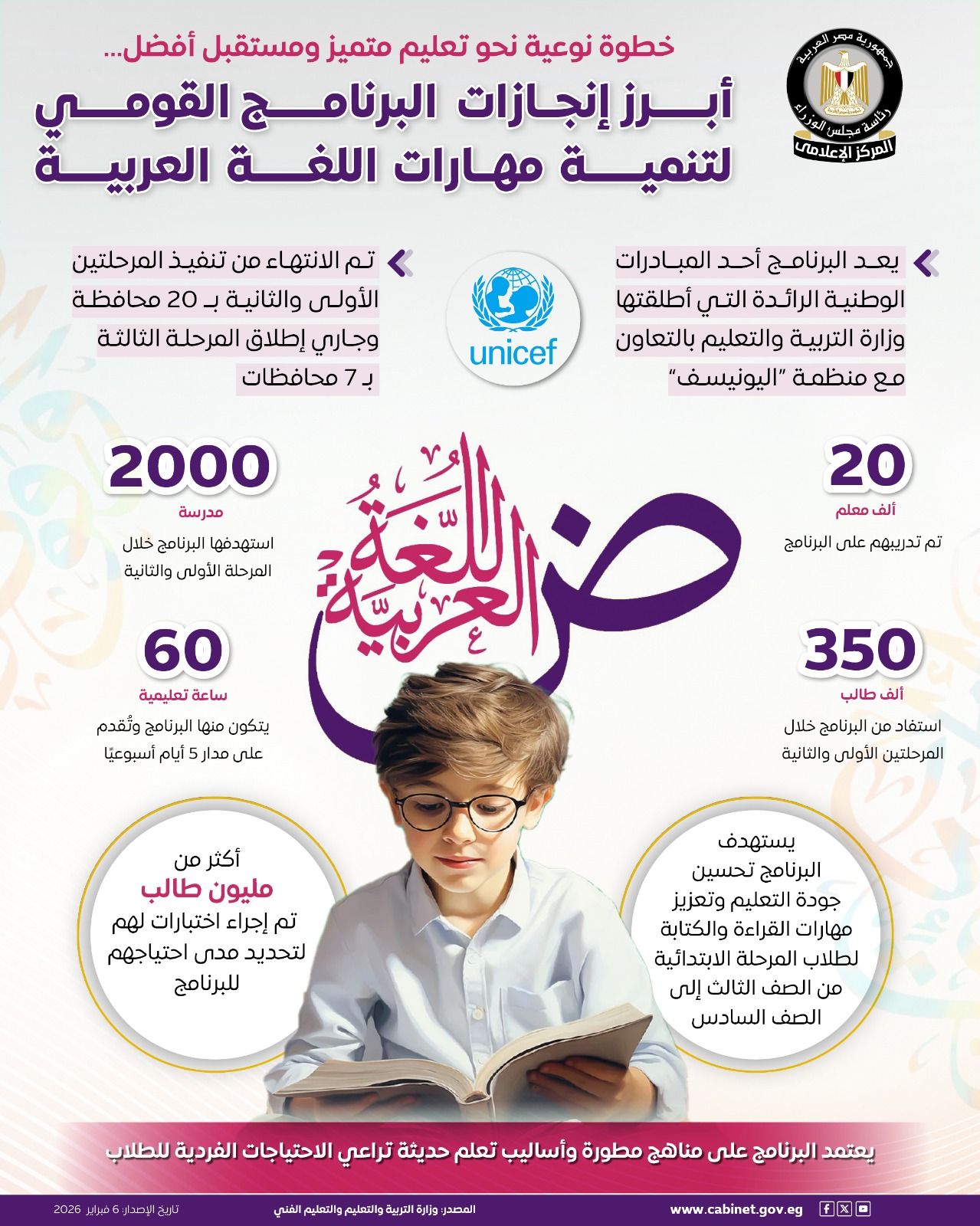 في إطار جهود الدولة لتعزيز جودة التعليم وتنمية مهارات اللغة الأساسية لدى طلاب المرحلة الابتدائية، تم إطلاق البرنامج القومي لتنمية مهارات اللغة العربية بالتعاون مع منظمة اليونيسف، وبمشاركة نخبة من خبراء اللغة العربية والمتخصصين في المجال.