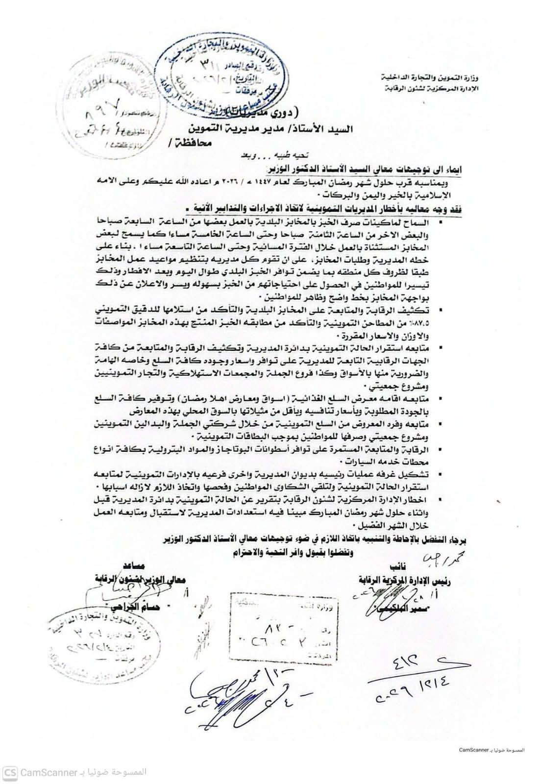وشددت الوزارة على ضرورة التزام المخابز بالمواعيد المقررة وجودة الإنتاج، مع تكثيف المتابعة الرقابية لضمان انتظام صرف الخبز وتلبية احتياجات المواطنين طوال الشهر الكريم.