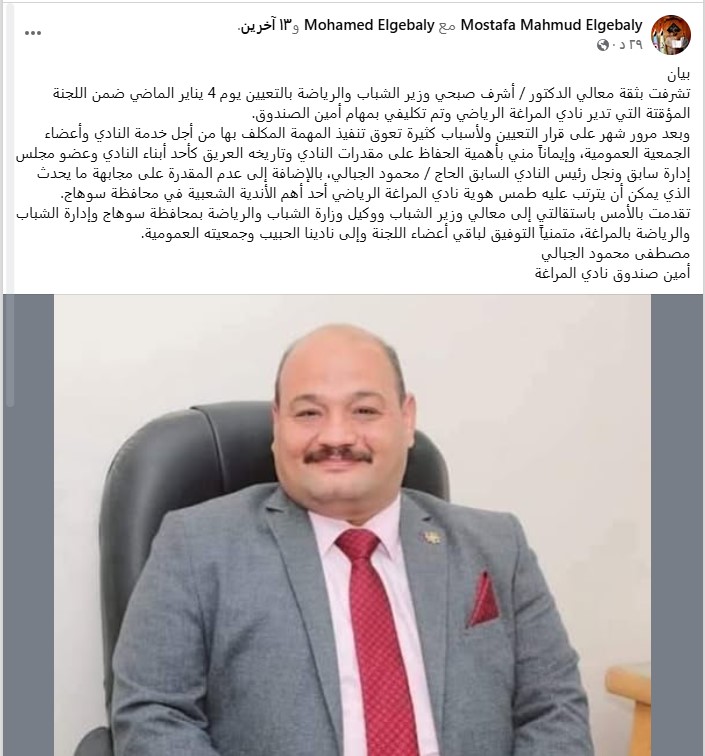 وقال مصطفى الجبالي عبر حسابه على «فيسبوك»: «تشرفت بثقة معالي الدكتور أشرف صبحي وزير الشباب والرياضة بالتعيين يوم 4 يناير الماضي ضمن اللجنة المؤقتة التي تدير نادي المراغة الرياضي وتم تكليفي بمهام أمين الصندوق».