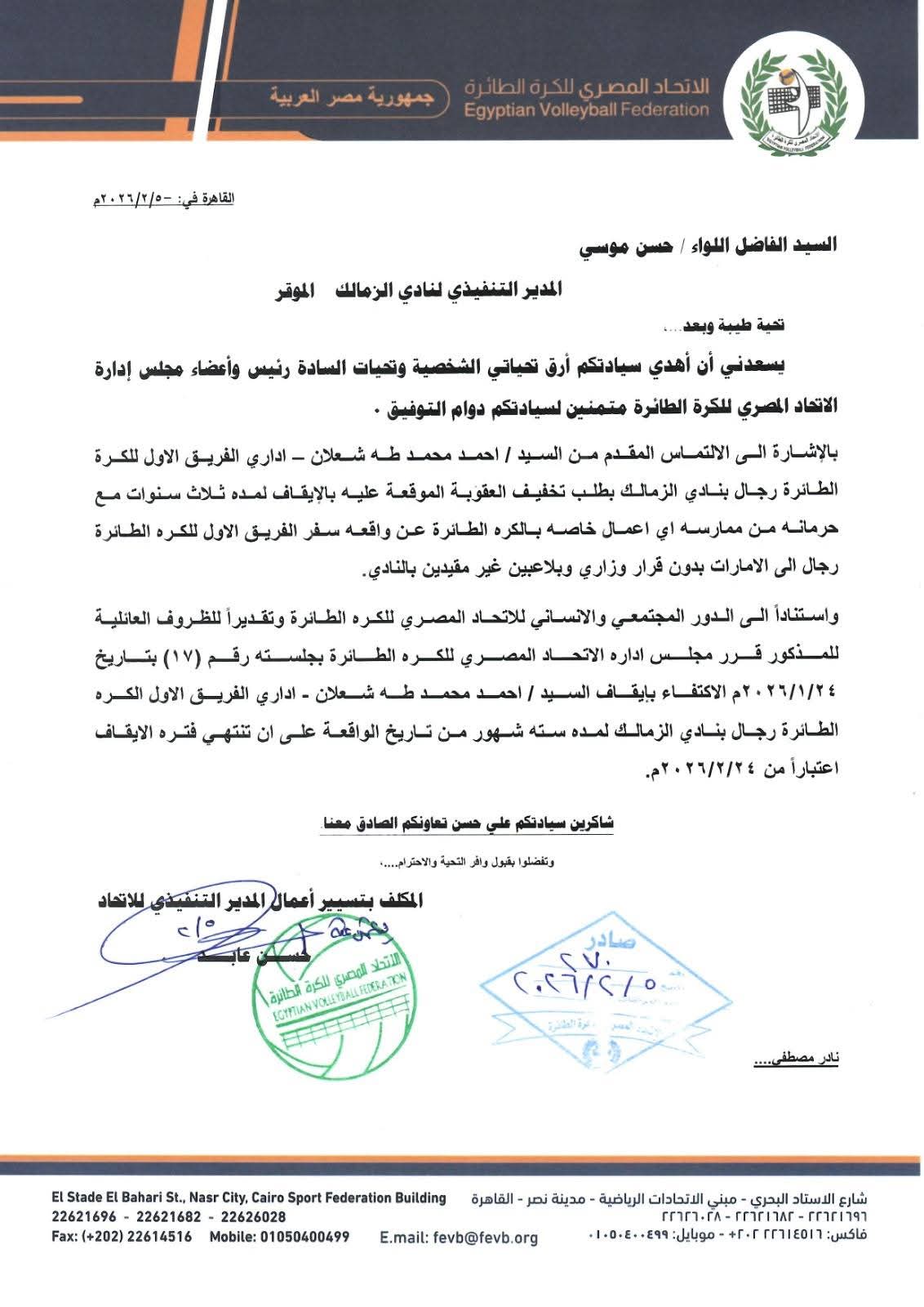 ويأتي قرار اتحاد الكرة الطائرة بعد قبول التظلم المقدم من نادي الزمالك، والذي طالب فيه بتخفيف عقوبة أحمد شعلان مراعاة للظروف الإنسانية والعائلية، وهو ما وافق عليه مجلس إدارة الاتحاد في جلسته رقم (17) المنعقدة بتاريخ 24 يناير 2026.