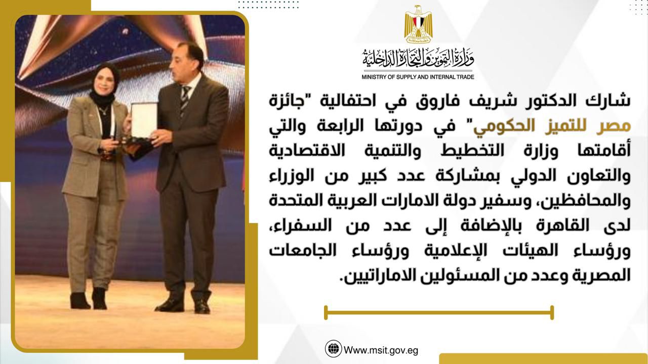 وشارك وزير التموين في احتفالية جائزة مصر للتميز الحكومي في دورتها الرابعة، بحضور رئيس مجلس الوزراء وعدد من كبار المسؤولين، حيث كرم عدد من مراكز الخدمة التموينية المطورة، من بينها أفضل مكتب خدمة مطور «تموين»، كما قدّم الوزير التهنئة للفائزين، مشيدًا بأداء مراكز الخدمة التموينية وما حققته من تطور ملموس في جودة الخدمات المقدمة للمواطنين.