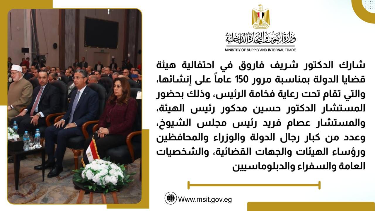 كما شارك الوزير في احتفالية هيئة قضايا الدولة بمناسبة مرور 150 عامًا على إنشائها، والتي شهدت تكريم عدد من رؤساء الهيئة السابقين والرموز القضائية، واستعرضت تاريخ الهيئة ودورها في الدفاع عن قضايا الدولة.