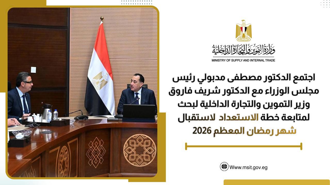 عقد الدكتور مصطفى مدبولي رئيس مجلس الوزراء اجتماعًا مع وزير التموين بمقر الحكومة بالعاصمة الإدارية الجديدة، حيث استعرض الوزير خطة الوزارة الشاملة لتأمين السلع الغذائية وتحقيق استقرار الأسواق خلال شهر رمضان 1447هـ / 2026م.