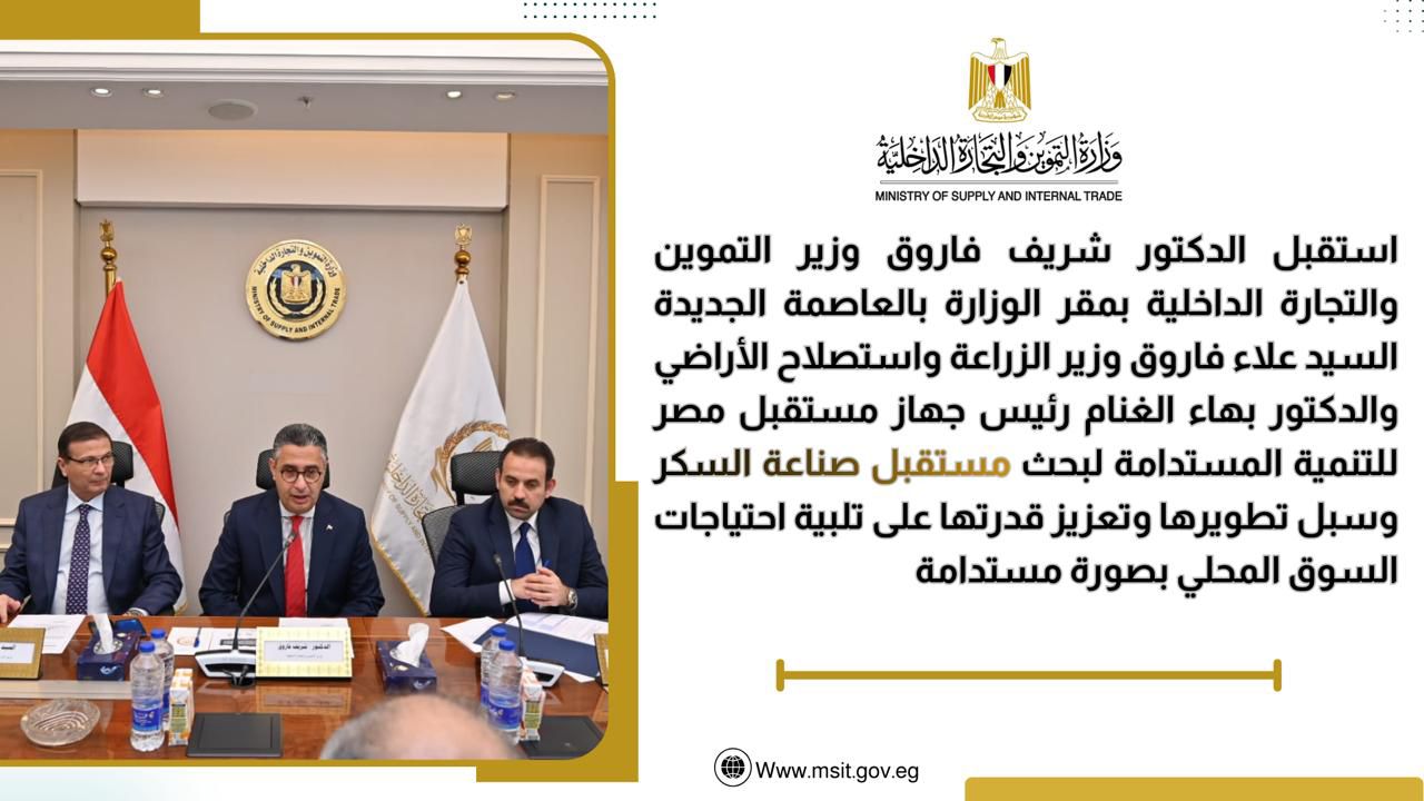 عقد وزير التموين اجتماعًا مشتركًا مع وزيري الزراعة وجهاز مستقبل مصر للتنمية المستدامة، لبحث سبل تطوير صناعة السكر وتعزيز الاكتفاء الذاتي، مؤكدًا أن السكر يمثل سلعة استراتيجية ذات أولوية للأمن الغذائي، كما عقد اجتماعًا موسعًا مع شركات السكر التابعة للدولة والقطاع الخاص، للتوسع في الزراعات التعاقدية وتحسين نظم الإدارة والتشغيل.