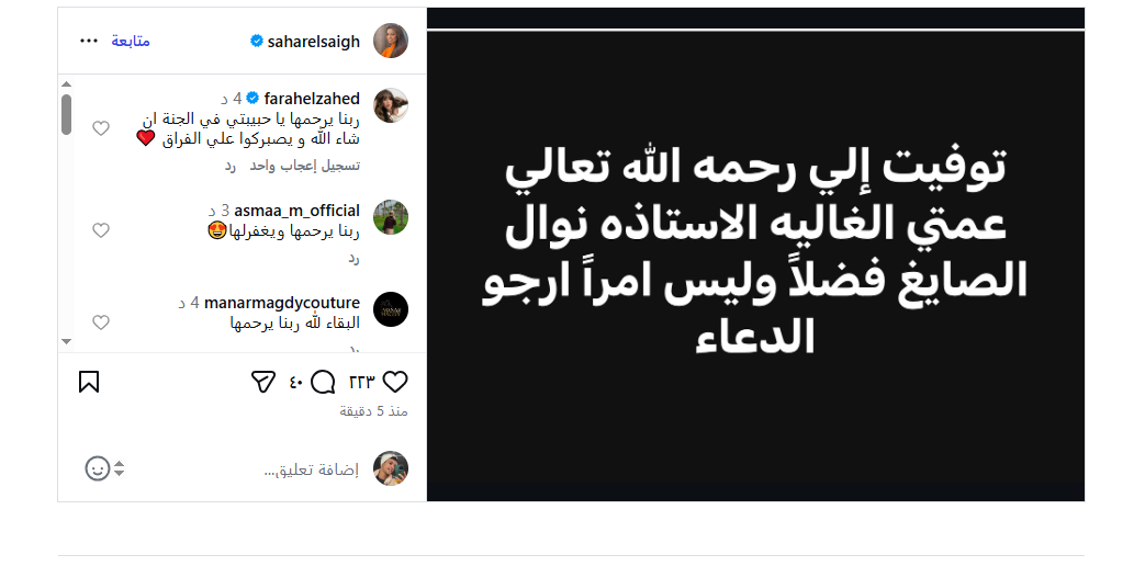أعلنت الفنانة سهر الصايغ وفاة عمتها، ونشرت بوست عبر حسابها الشخصي على موقع تبادل الصور والفيديوهات “إنستجرام”.