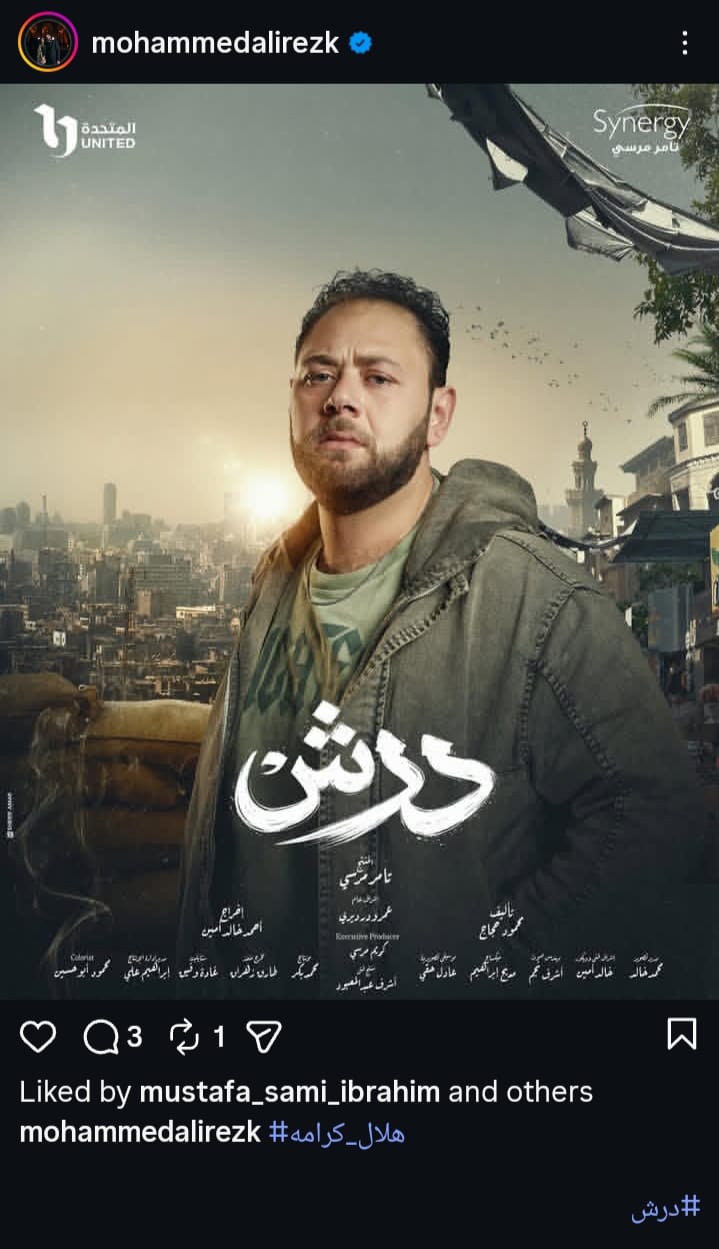 ونشر محمد علي رزق المصلق الدعائي لشخصيته في المسلسل، وذلك عبر حسابه الرسمي بموقع التواصل الاجتماعي “انستجرام”، وعلق عليها قائلا: هلال كرامة، درش.