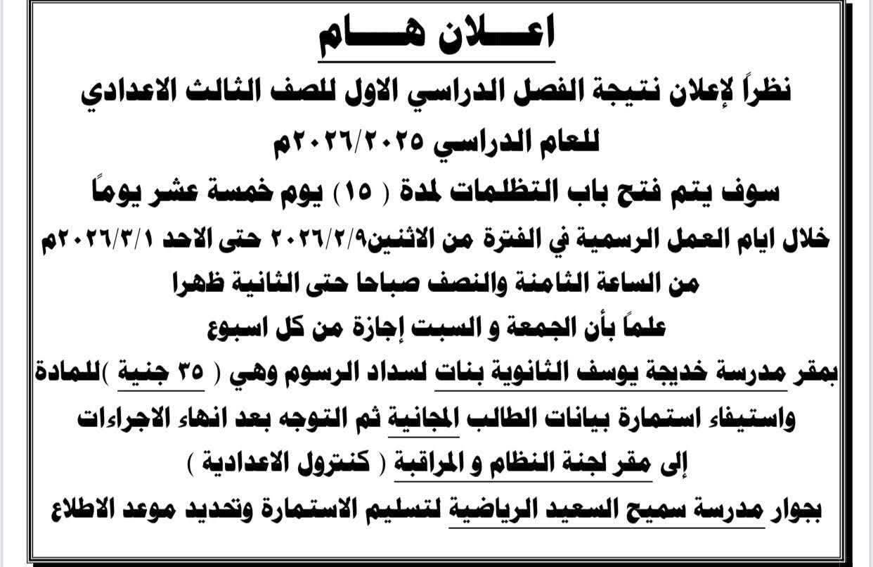 عقب إسدال الستار رسمياً على ماراثون امتحانات الفصل الدراسي الأول واعتماد النتائج ليلة أمس، أعلنت مديرية التربية والتعليم بمحافظة أسيوط، عن بدء تلقي طلبات التظلم من نتيجة الشهادة الإعدادية للعام الدراسي 2025 / 2026، وذلك اعتباراً من صباح غداً الاثنين الموافق 9 فبراير 2026، حيث تقرر فتح الباب أمام الطلاب وأولياء الأمور لمدة 15 يوماً متصلة، تنتهي يوم الأحد الموافق 1 مارس 2026، وذلك لإتاحة الفرصة الكاملة لكل طالب للتحقق من درجاته وضمان حصوله على حقه، وفق جدول زمني محدد يبدأ العمل فيه يومياً من الساعة 8:30 صباحاً وحتى الساعة 2 ظهراً، مع استثناء أيام الجمعة والسبت من كل أسبوع باعتبارها إجازات رسمية، وقد وضعت المديرية خريطة إجرائية واضحة لمنع التكدس وتسهيل الخطوات، تبدأ بتوجه ولي الأمر أو الطالب إلى مقر "مدرسة خديجة يوسف الثانوية بنات" لسداد الرسوم المقررة وقدرها 35 جنيهاً عن كل مادة يرغب الطالب في التظلم منها، ثم استيفاء البيانات في "الاستمارة المجانية" المعدة لذلك، وعقب إتمام الإجراءات المالية والإدارية، يتوجه ولي الأمر بالأوراق وإيصال السداد إلى المقر الرئيسي لـ "لجنة النظام والمراقبة" (كنترول الإعدادية) الكائن بجوار مدرسة سميح السعيد الرياضية، لتسليم الملف وتحديد موعد جلسة الاطلاع على كراسة الإجابة.