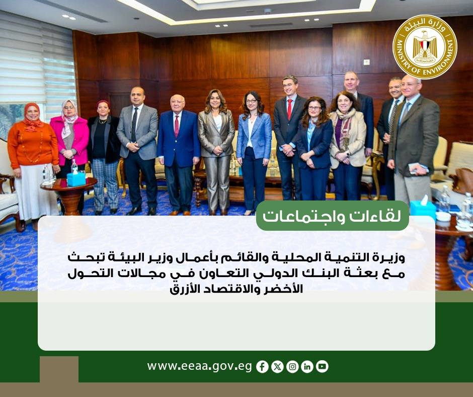 الدكتورة منال عوض وزيرة التنمية المحلية والقائم بأعمال وزير البيئة تعقد اجتماعا موسعا مع بعثة البنك الدولي لمناقشة آخر مستجدات التعاون في مجالي التحول الأخضر و الاقتصاد الأزرق، وتثمن التعاون مع البنك الدولي في تنفيذ مشروع ادارة تلوث الهواء وتغير المناخ بالقاهرة الكبرى.
